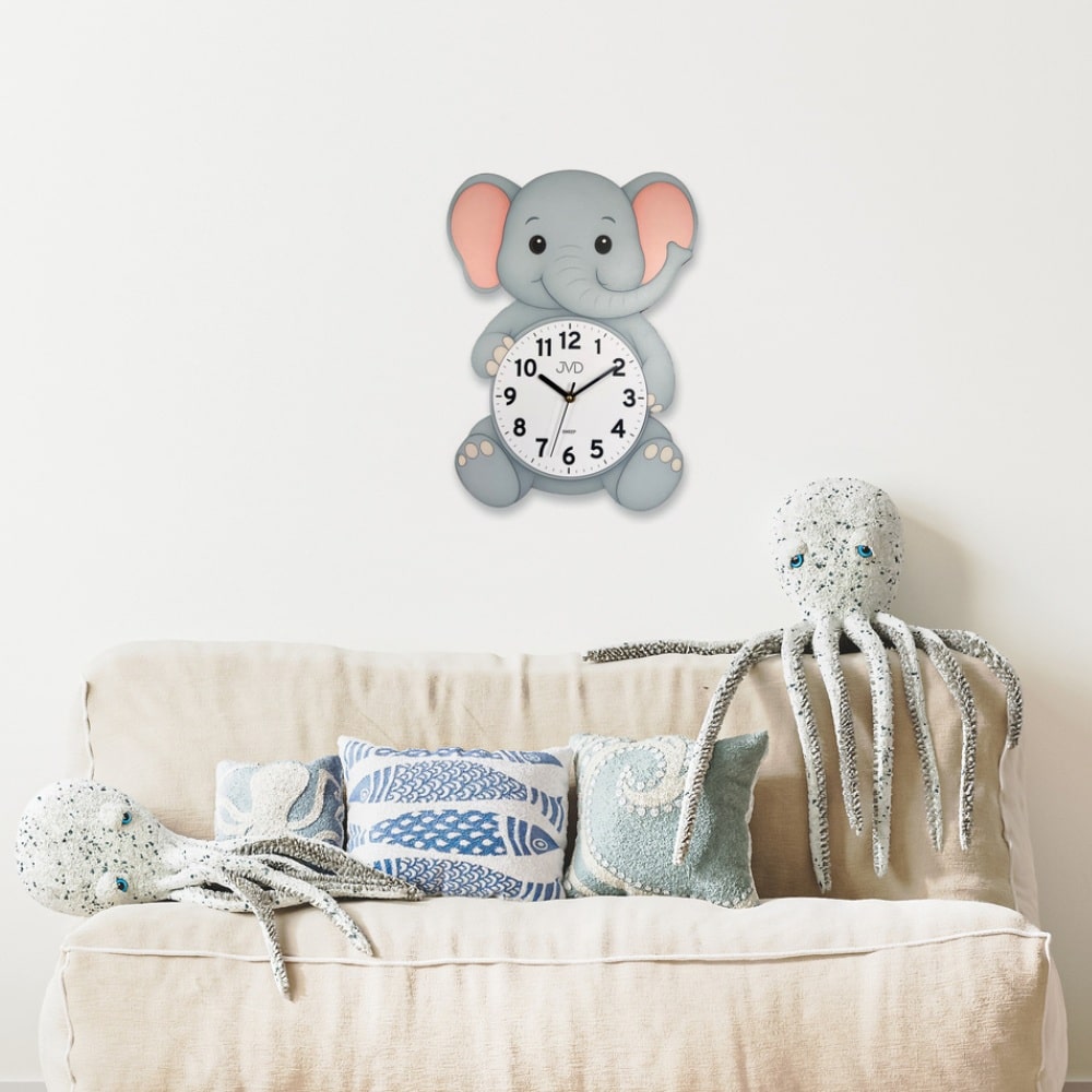 • Klok HJ112J is een bedrukte kinderklok wandklok van hout in de vorm van een olifant.