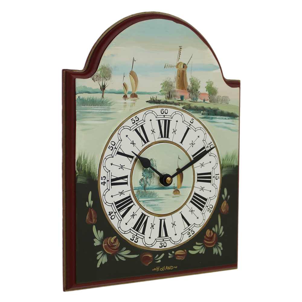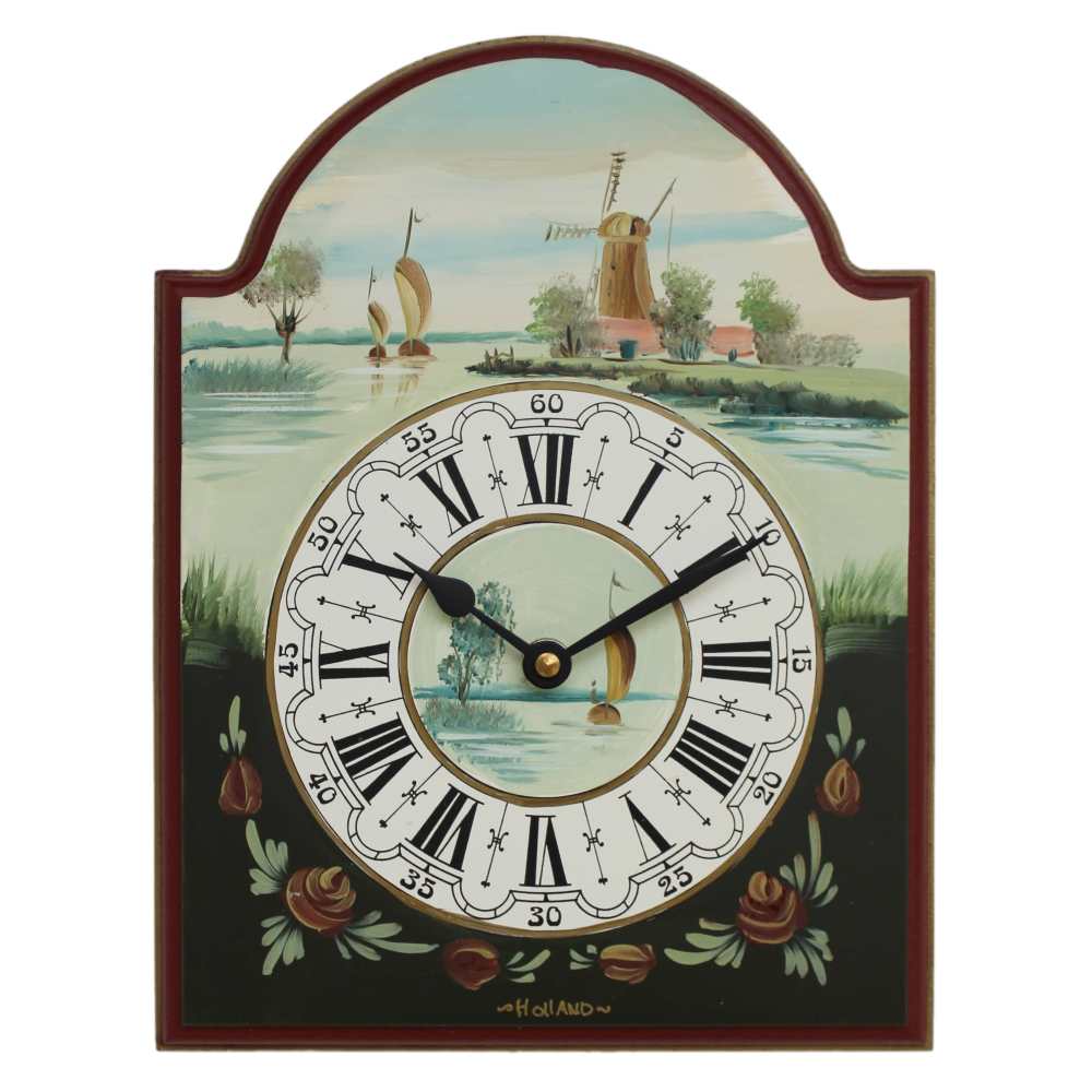 • Klok 140-805 is een handbeschilderde houten schilderij klok waarop een klassiek Hollands polderlandschap met een molen, zeilboten en bomen is afgebeeld.