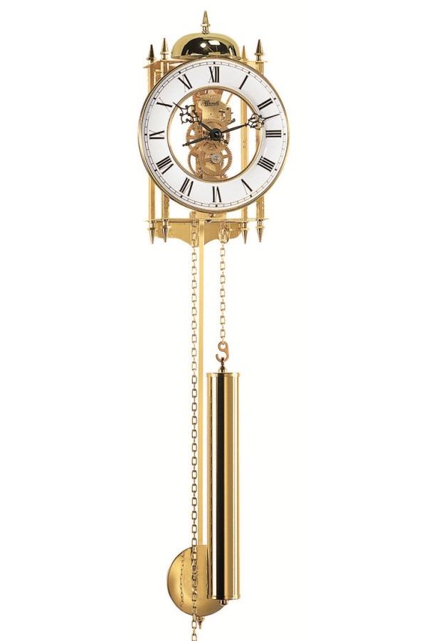 • Klok 70526-000701 is een skeletklok in een glanzende messingkleurige metalen uitvoering.