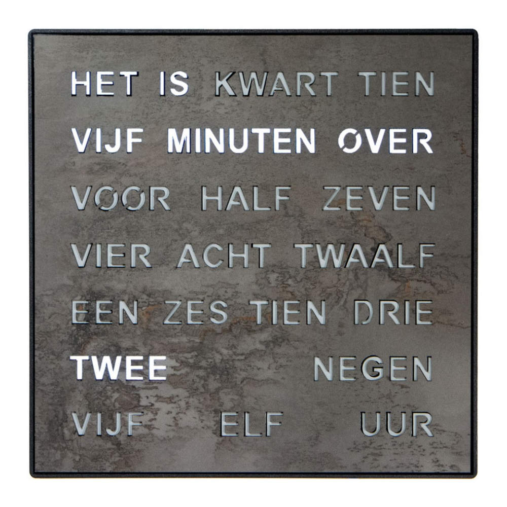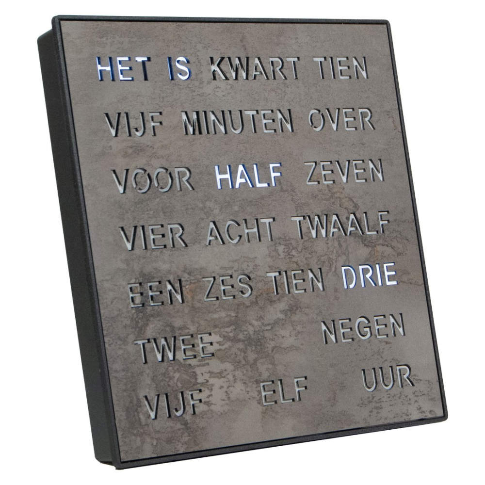 • Klok 1247NL is een digitale woordklok met een grijs marmer motief frontpaneel en een zwarte behuizing.