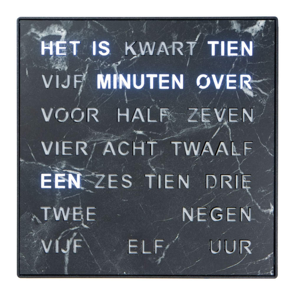 • Klok 1247NLS is een digitale woordklok met een zwart marmer motief frontpaneel en een zwarte behuizing.