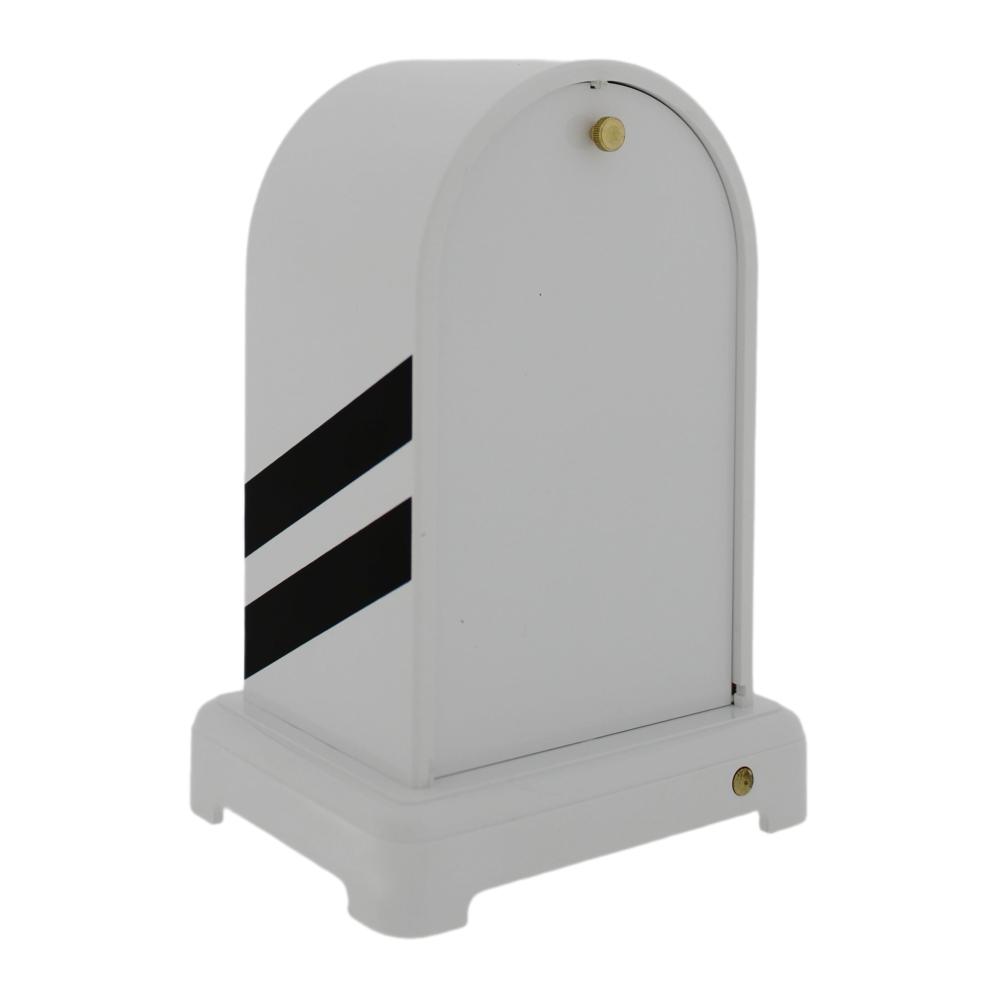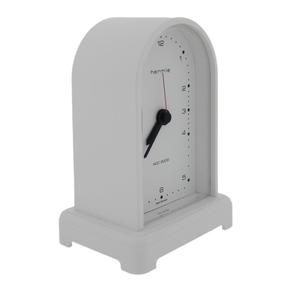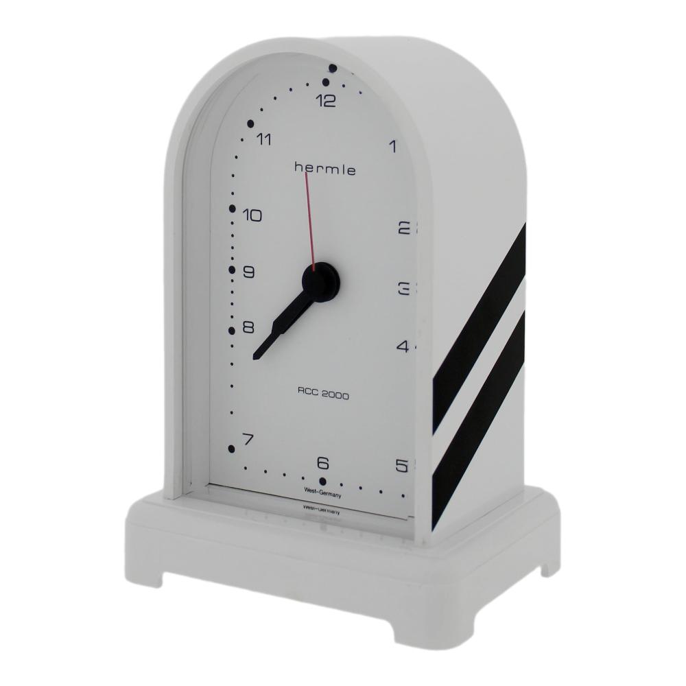 • Klok 12090-000800 is een tafelklok in een witte kunststof uitvoering met zwarte sierstrepen aan de rechter zijkant.