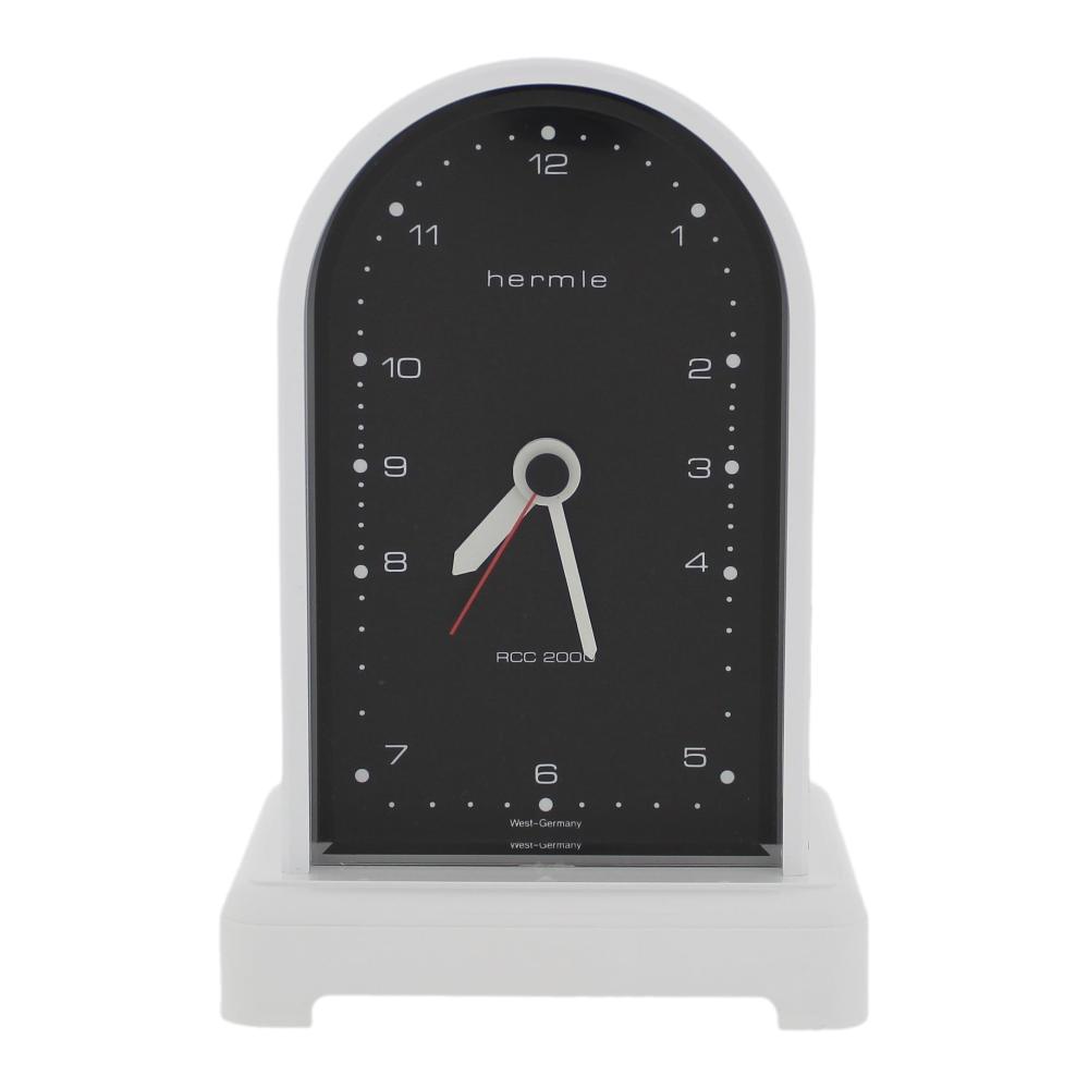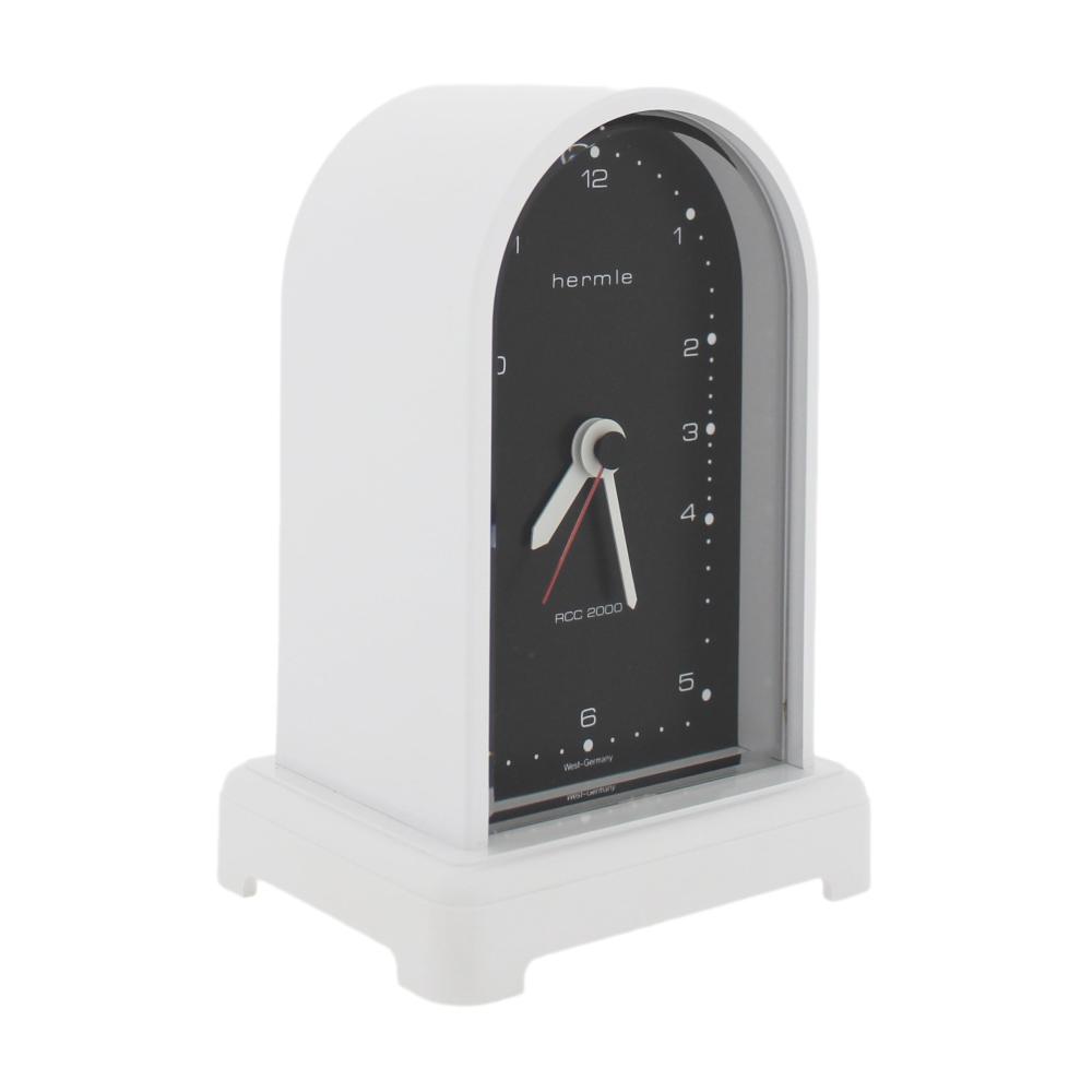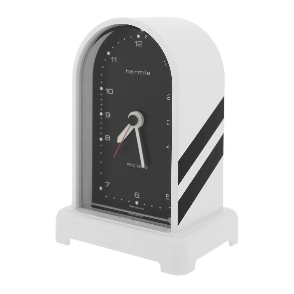 • Klok 12092-000800 is een tafelklok in een witte kunststof uitvoering met zwarte sierstrepen aan de rechter zijkant.