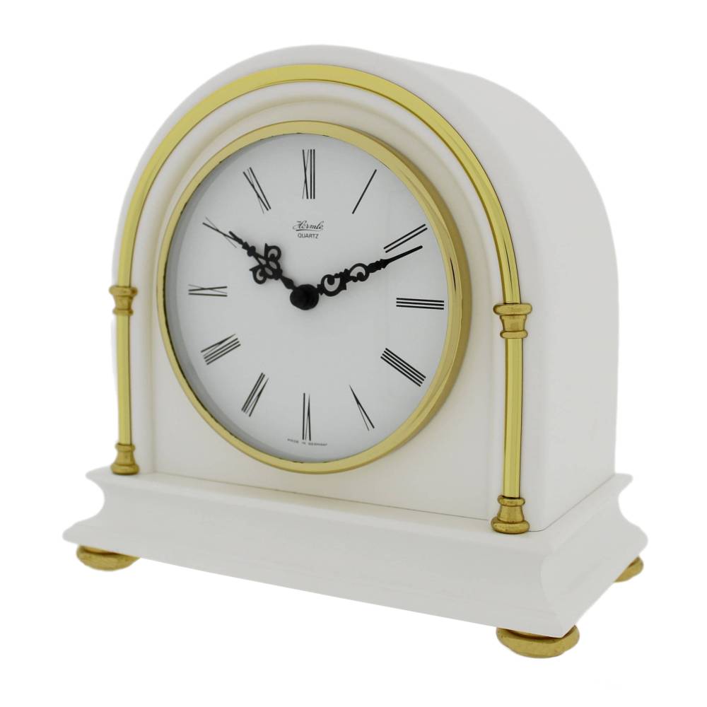 • Klok 22475-250938 is een tafelklok in matte wit gelakte houten uitvoering met messing versieringen en messing pootjes.