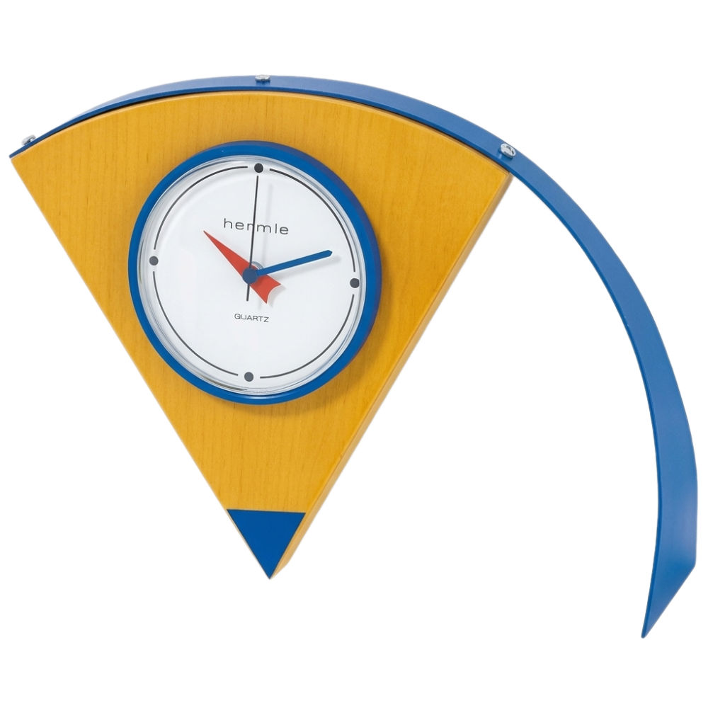 • Klok 22737-382600 is een tafelklok van beukenhout met een blauw gelakte standaard en opgelegde driehoek van metaal.