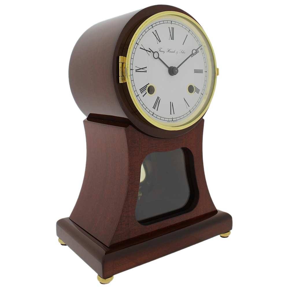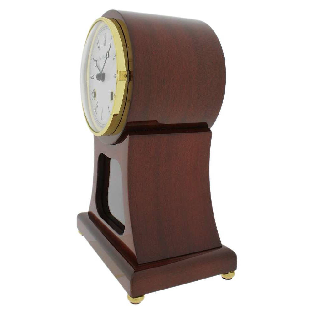 • Klok 22901-070131 is een pendule tafelklok in een mahonie gelakte houten uitvoering met messing pootjes, slinger en rand om de wijzerplaat.
