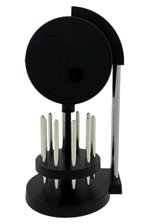 • Klok 89005-002300 is een design tafelklok in een mat zwarte kunststof uitvoering met zilverkleurige pilaren en een draaislinger met zilverkleurige staven.