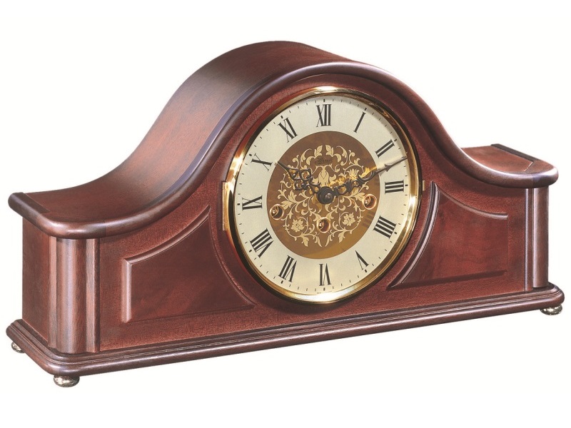 • Klok 21142-070340 is een tafelklok in een mahonie gelakte houten uitvoering met opgelegde houten sierstukken en messing pootjes.