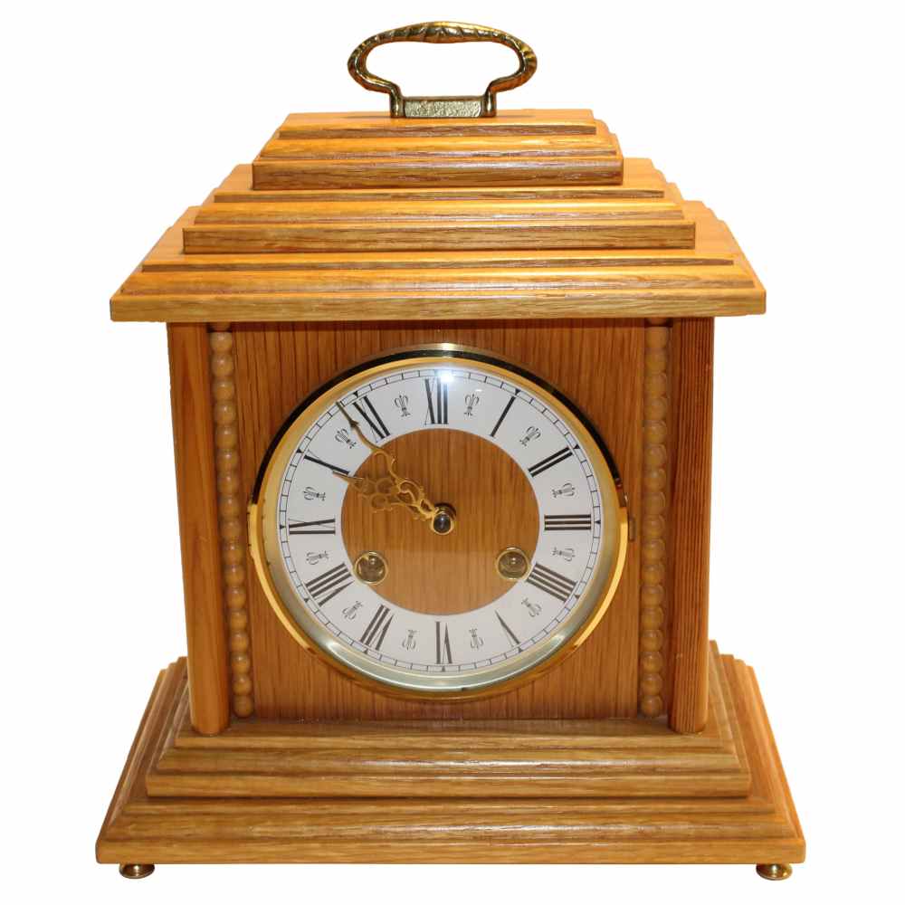 • Klok TP25LE is een tafelklok in een licht eikenhouten uitvoering met een messing beugel, pootjes en rand om de wijzerplaat.