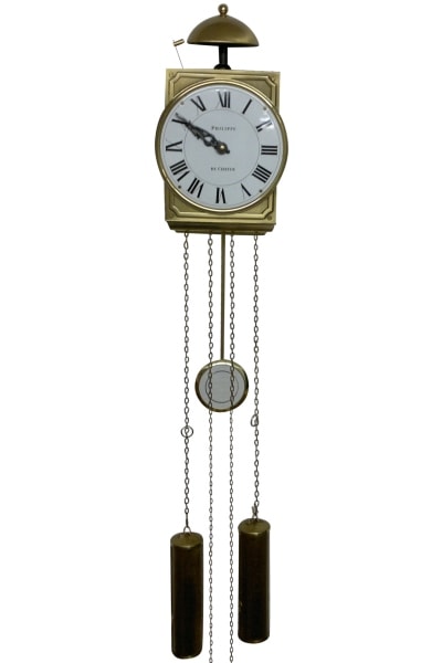 • Klok 1450B is een Franse comtoise klok stijl wandklok van messing in een bronskleurige uitvoering met een witte geëmailleerde wijzerplaat, messingkleurige met witte slinger en opgelegde bronskleurige deurtjes aan de zijkant.