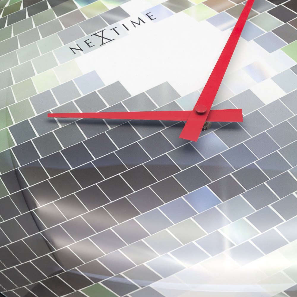 • Klok NE3293 is een wandklok met een discobal print wijzerplaat, gebold mineraalglas, zwarte kunststof rand en rode metalen wijzers.