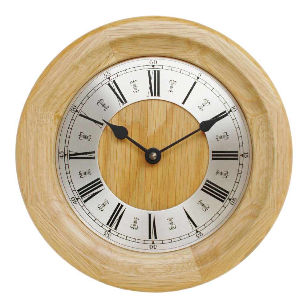• Klok 1603036 is een wandklok in een massief licht eikenhouten uitvoering met een afgeronde buitenrand.