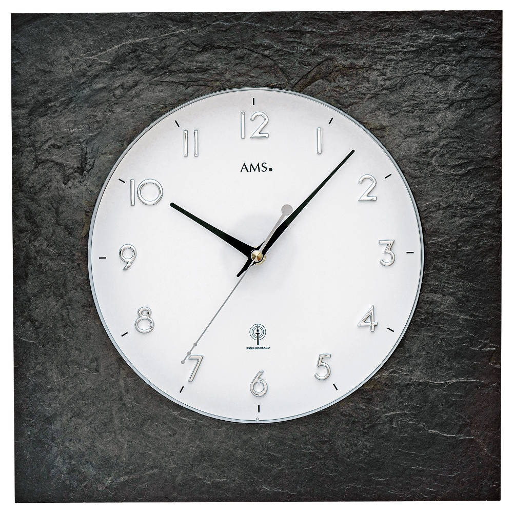 • Klok 5546 is een vierkante wandklok van leisteen met een witte wijzerplaat met opgelegde chroomkleurige cijfers en een mineraalglas.