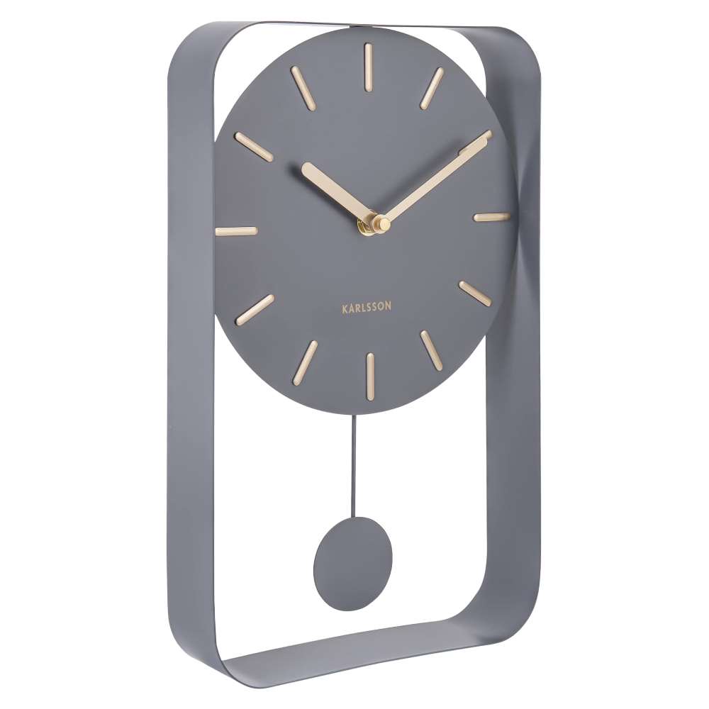 • Klok KA5796GY is een wandklok in een mat grijze stalen uitvoering met opgelegde matte goudkleurige urenmarkeringen en matte goudkleurige wijzers.