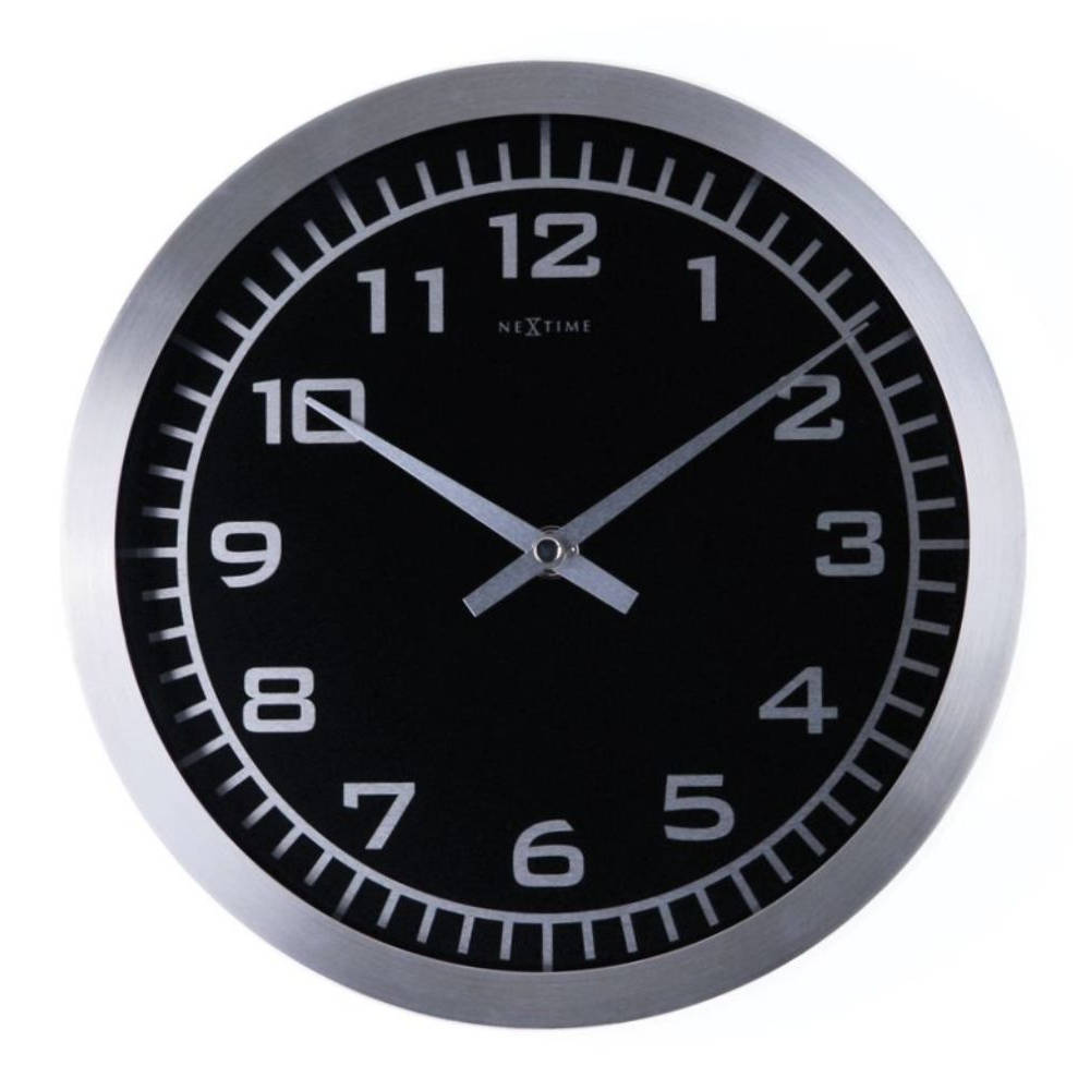 • Klok NE2953 is een wandklok met een matte aluminium rand en een zwarte wijzerplaat met matte zilverkleurige opgedrukte cijfers en markeringen.