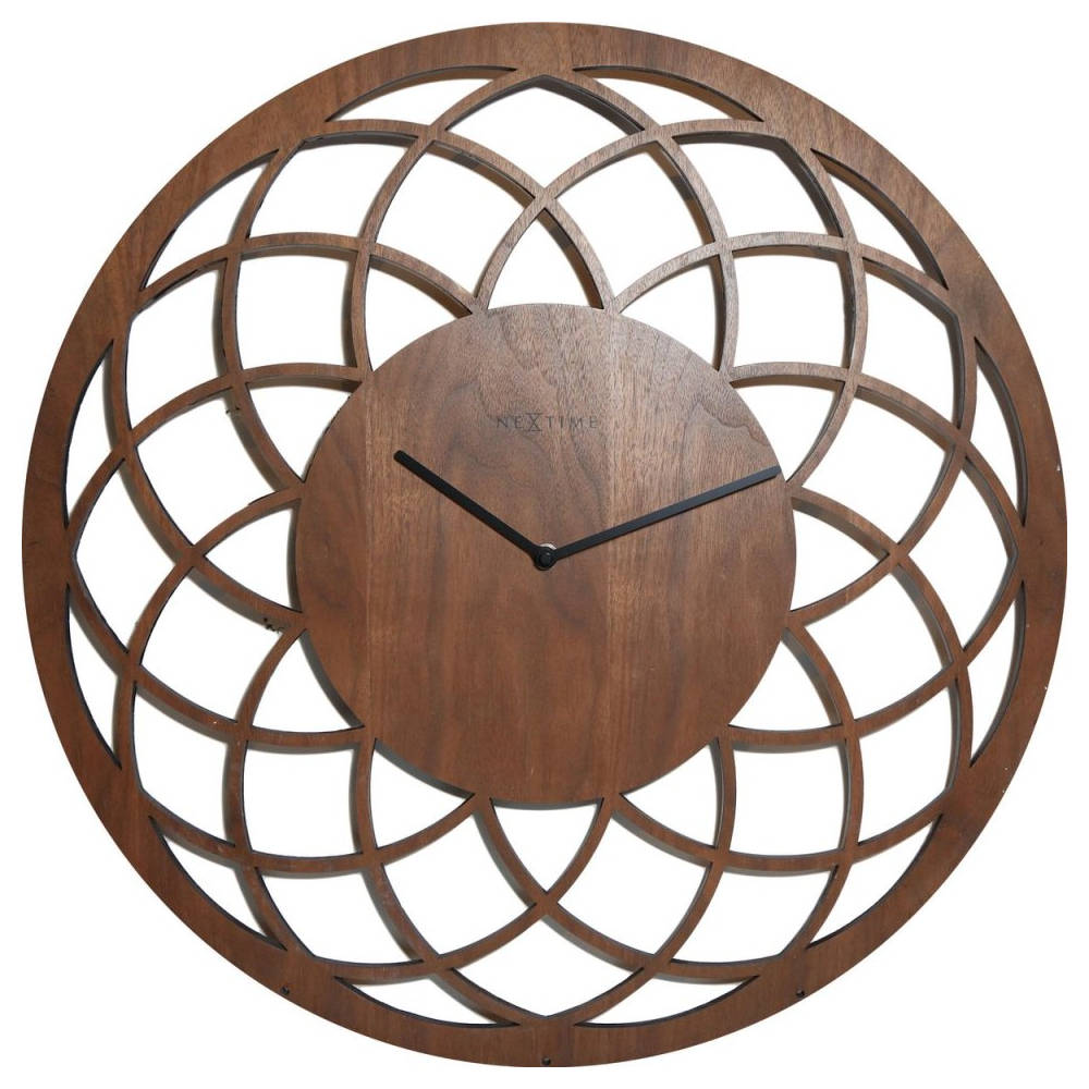 • Klok NE3115BR is een grote design wandklok van uitgelaserd hout met een notenhouten motief.