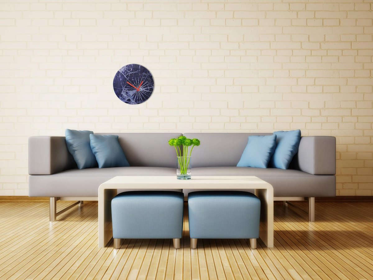 • Klok NE8147 is een wandklok van glas bedrukt met een donkerblauwe print van een gebroken glasplaat.