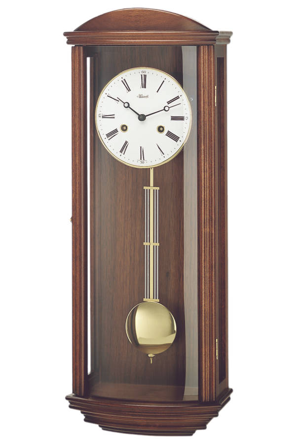 • Klok 70652-030141 is een regulateur wandklok in een massief notenhouten uitvoering met een messing slinger en rand om de wijzerplaat.