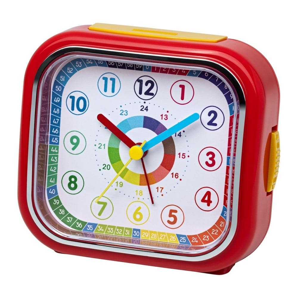 • Wekker 0703-1 is een rode kinderwekker met gele knoppen met een speciale wijzerplaat om ondersteuning te bieden bij het leren klokkijken.