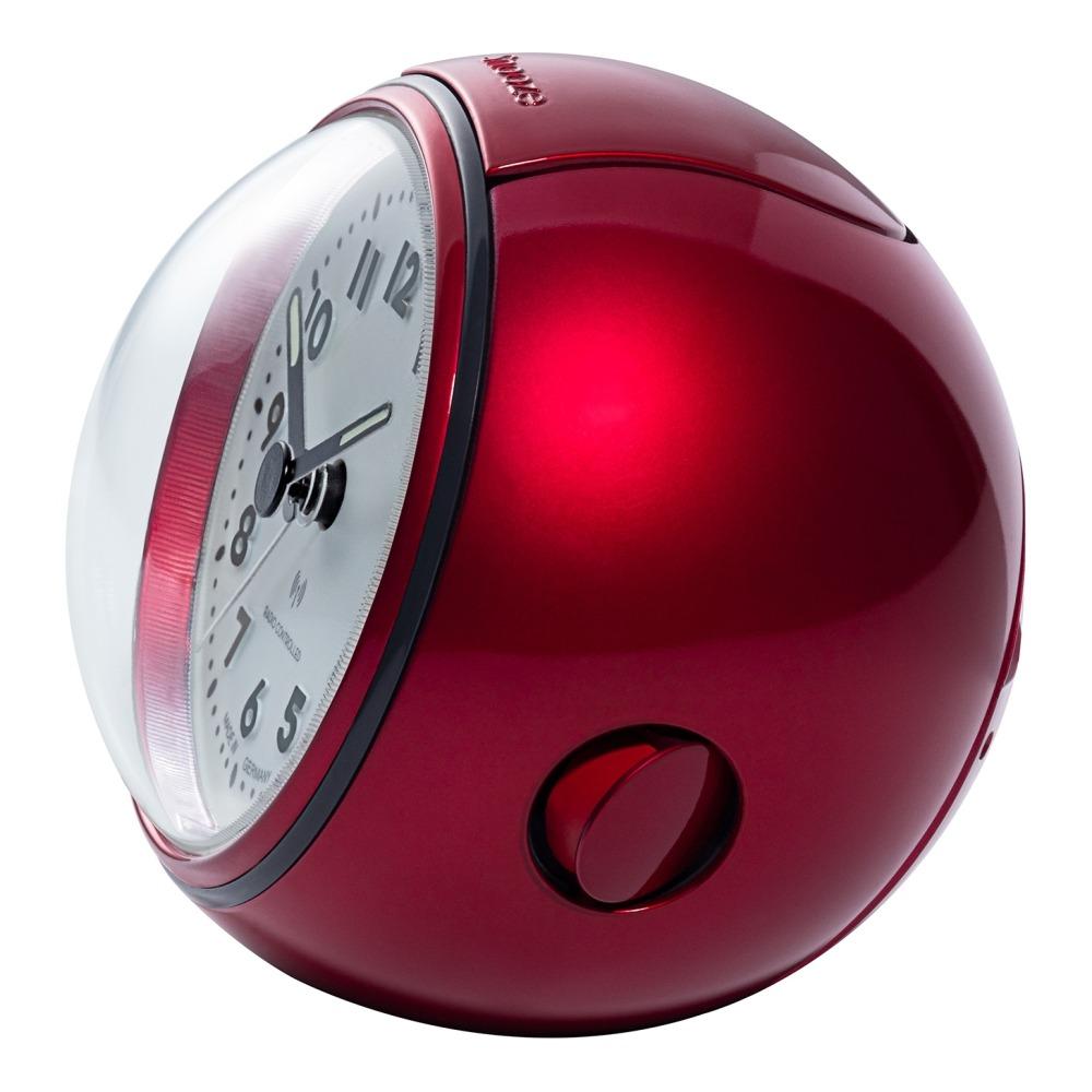 • Wekker 0544-1 is een ronde kunststof wekker in een metallic donkerrode uitvoering waarbij de voorkant is ingelegd met een zwarte ring.