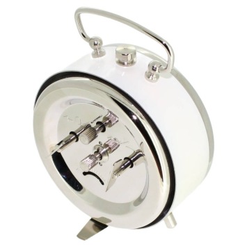 • Wekker 10-7692 is een mechanische wekker in een witte metalen uitvoering met chroomkleurige metalen rand, beugel, pootjes, drukknop, opwindsleutels en verstelknop.